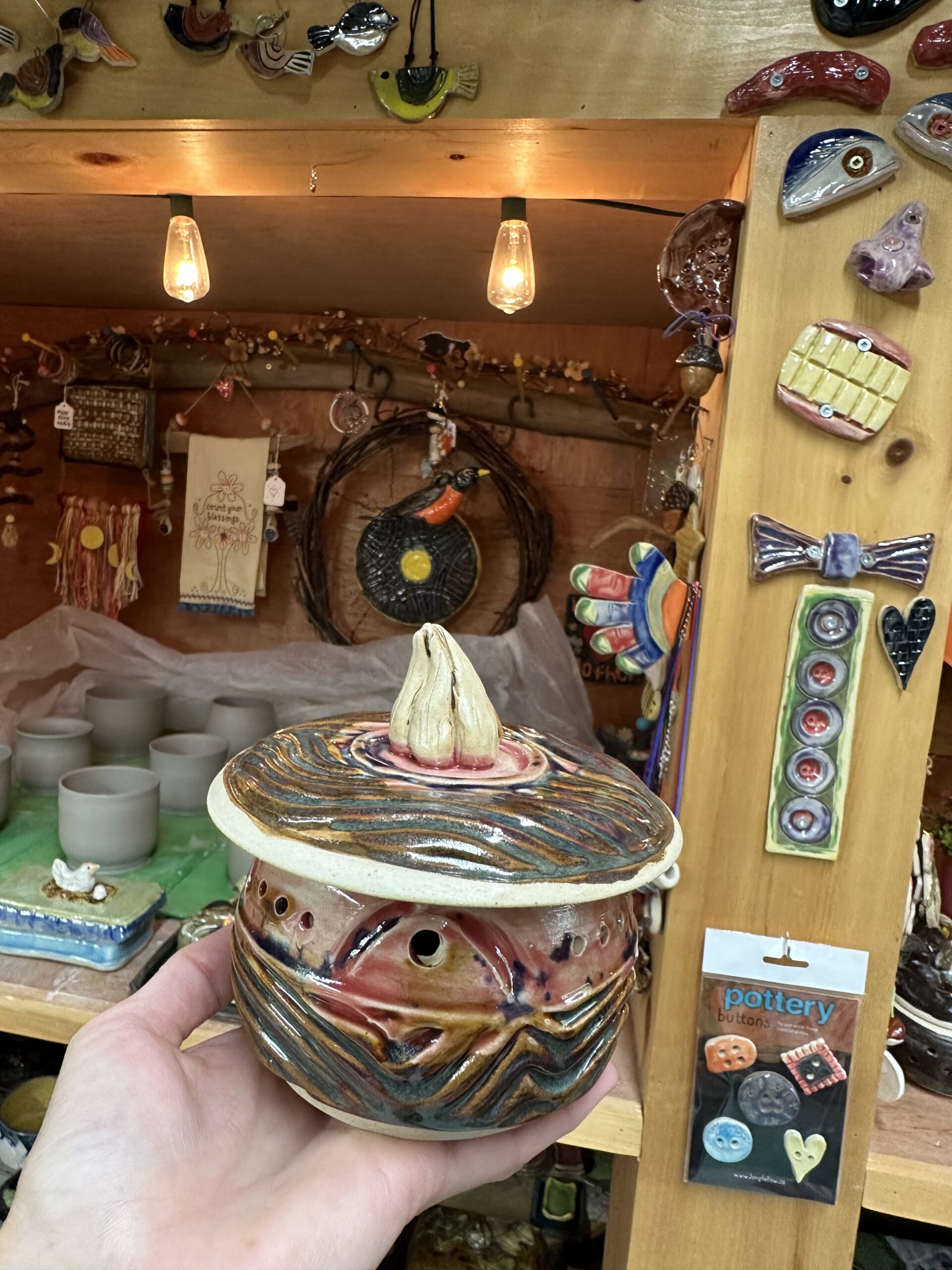 Created in the back woods of West Nipissing, by your artist friend Liane Longfellow. All our pottery pieces are one of a kind, microwave and dishwasher safe (although you likely won’t do either of those with this piece) and ready to be enjoyed. Using hand crafted pottery will make you happy, supporting a local artist is a super power, use it!