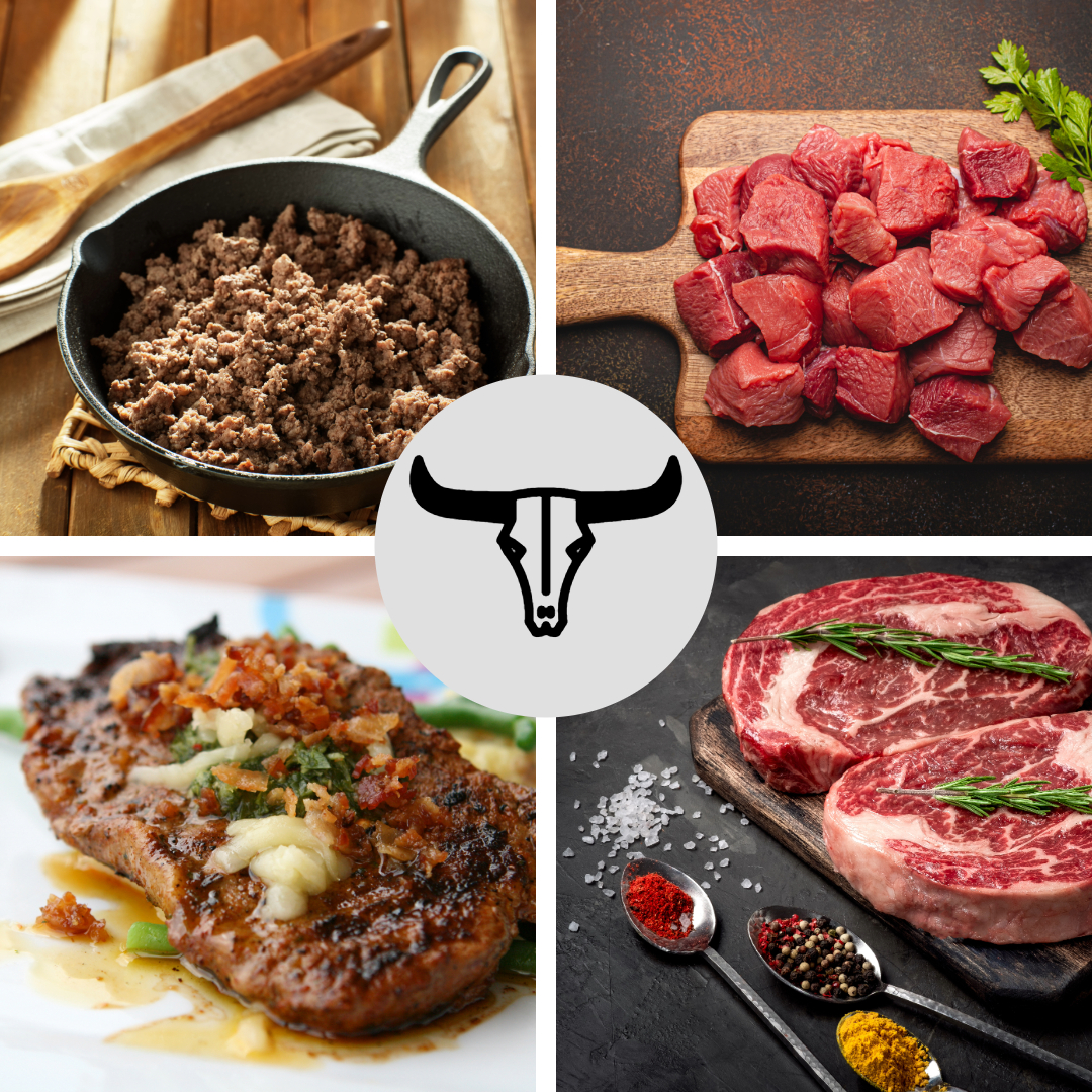 A 10 LBS mix of delicious bison. This box includes: Ribeye steaks, Stewing Meat, Ground Bison and Minute Steaks.