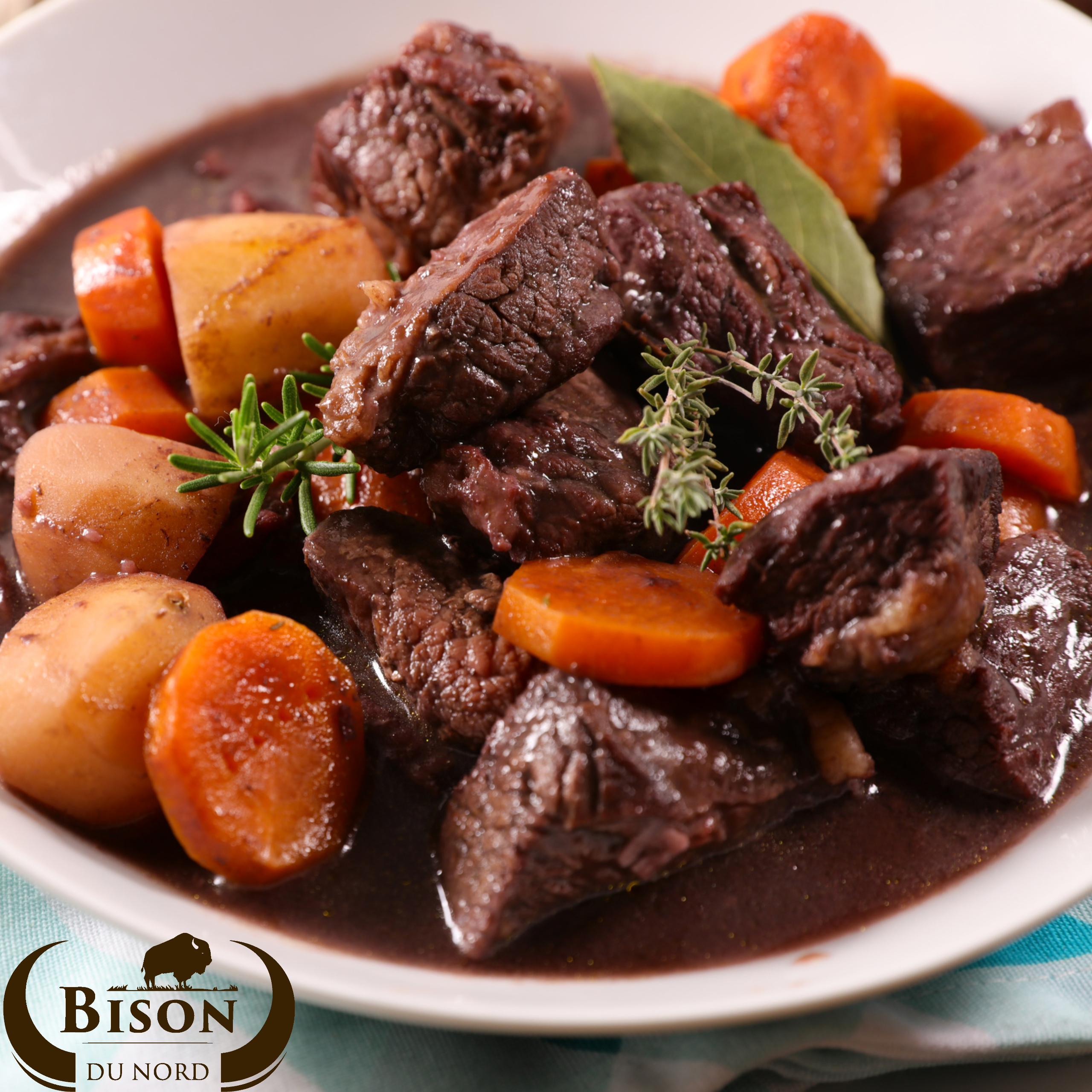 Bison stew cubes, wrapped in brown butcher paper to cut down on the use of plastics and frozen to maintain freshness.