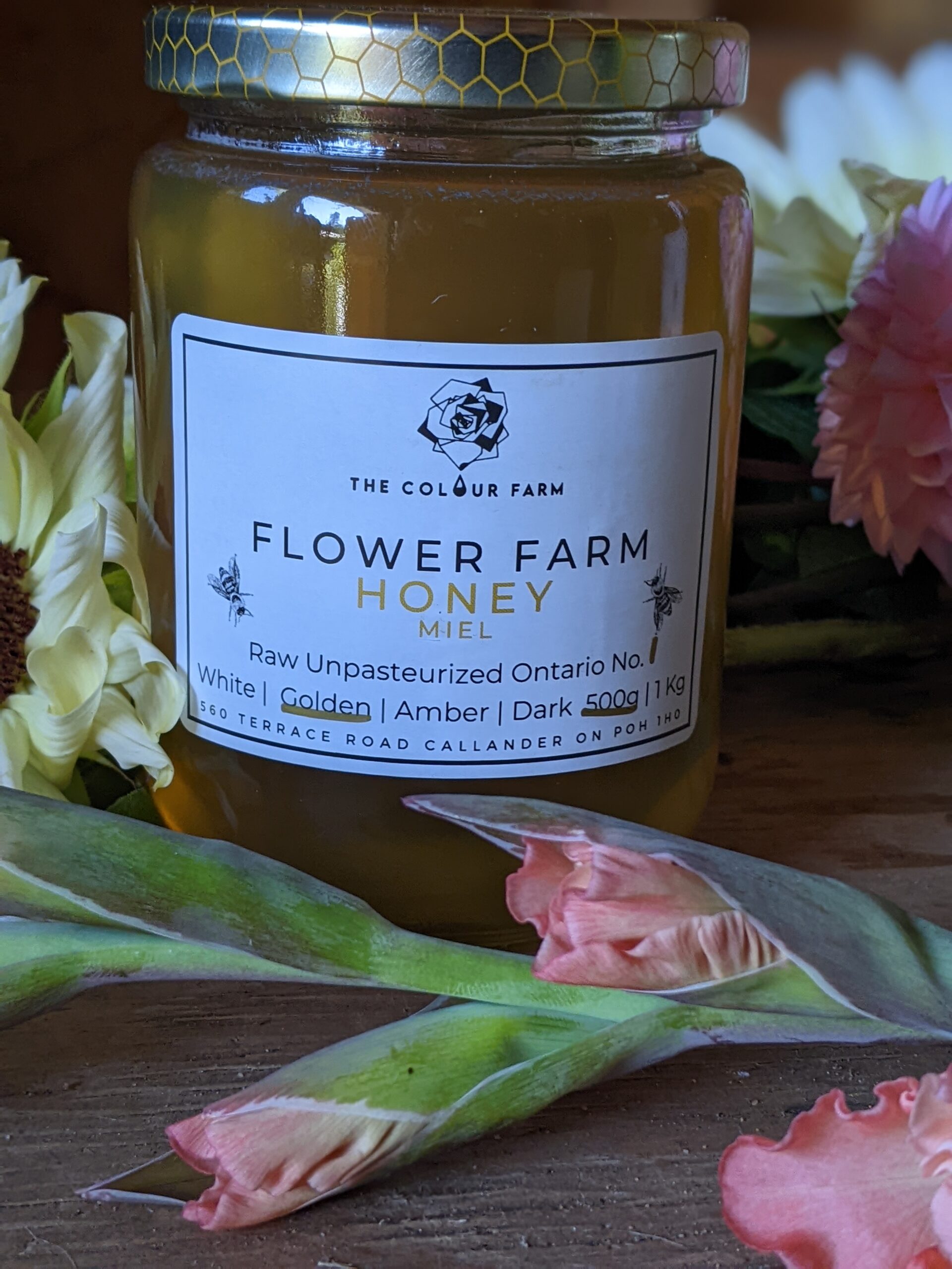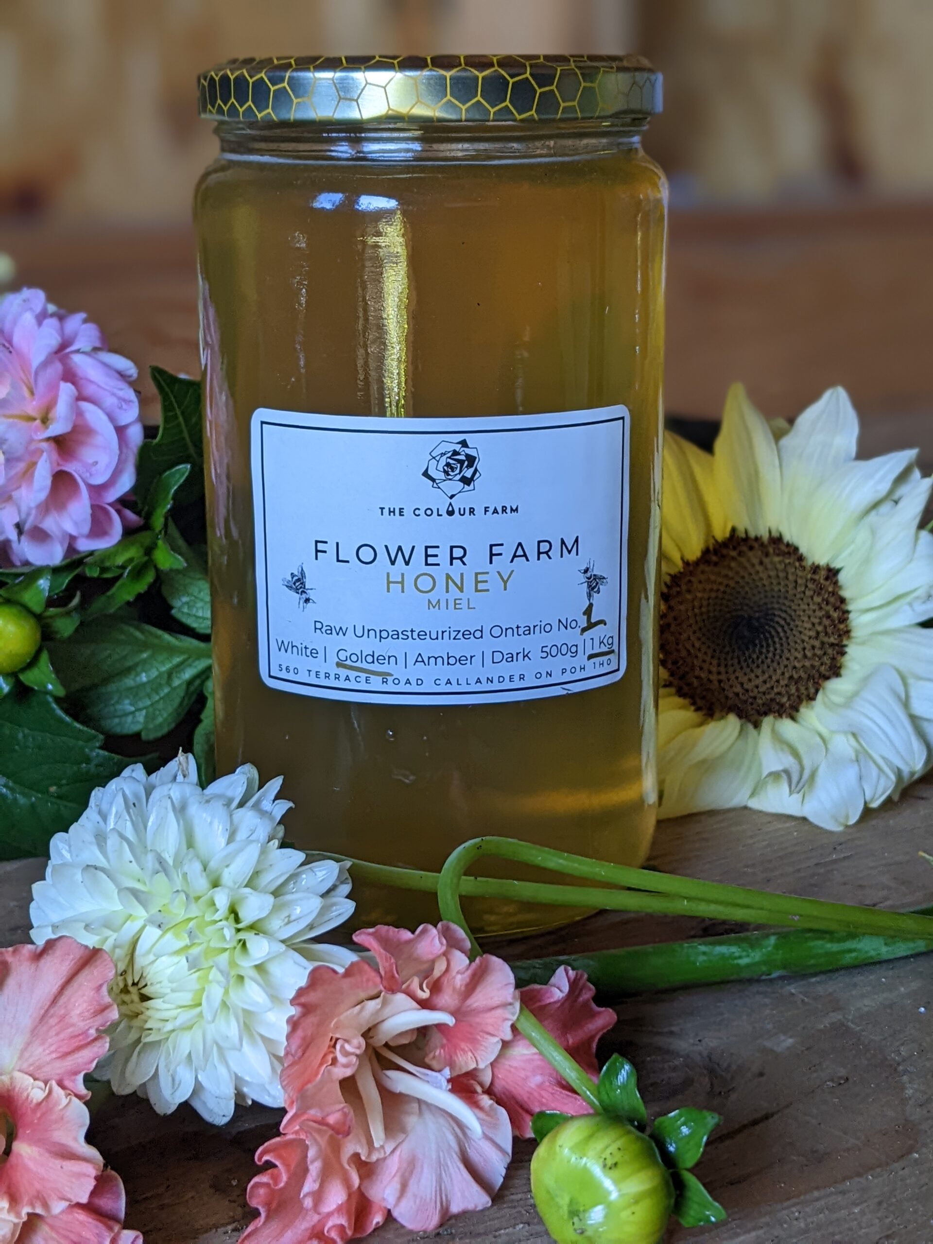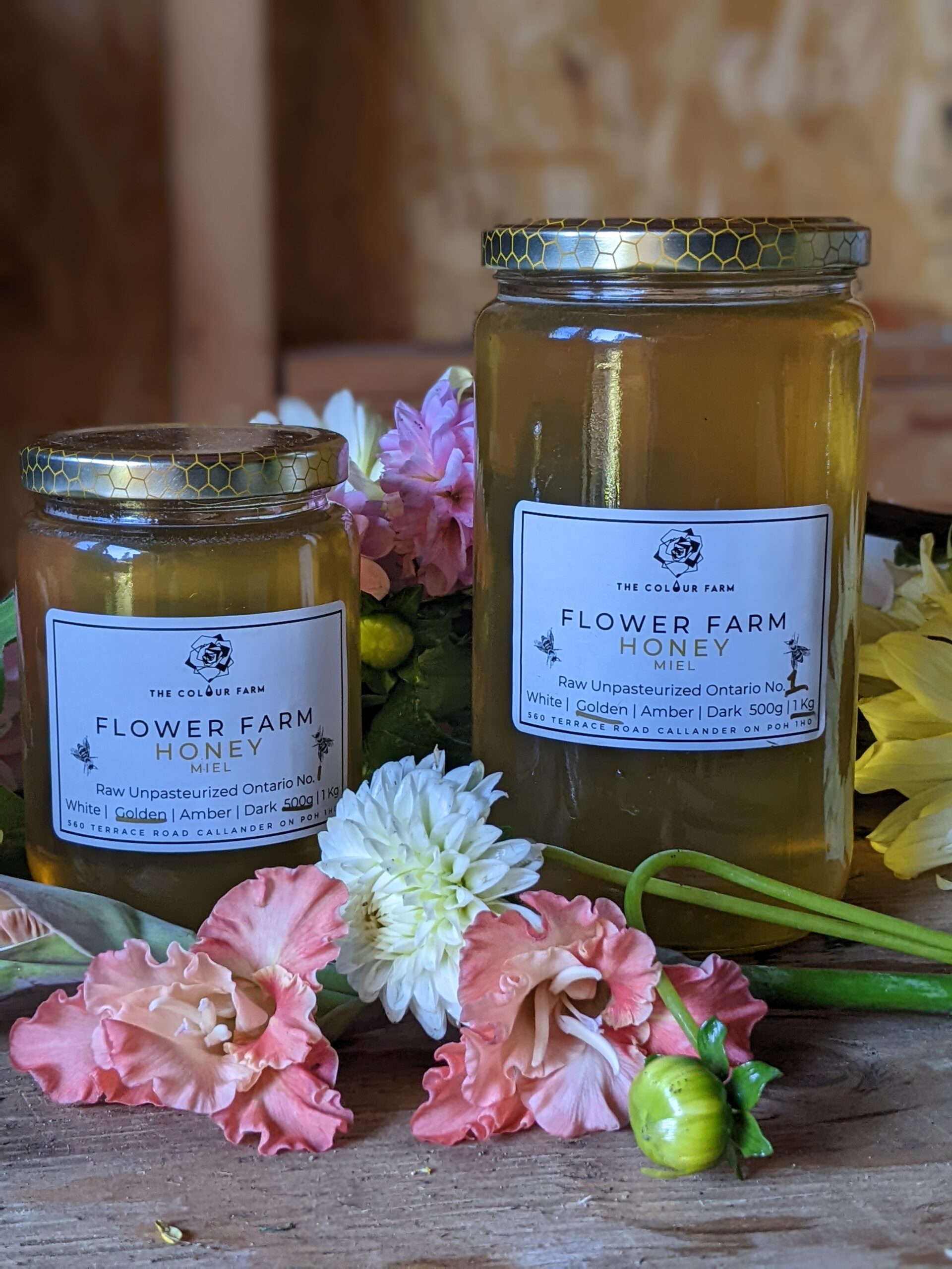 Our goal is first and foremost to maintain the health of our colonies. To accomplish this we limit the number of hives in any given location to ensure each colony is well resourced. This has the added benefit of not out-competing our native bee and insect populations. The use of cover crops on the farm not only improves soil fertility, but is put to use by the foraging bees. We select flowering cover crops and allow them to reach maturity to create additional forage for our bees. These include among others: buckwheat, clover, trefoil, and vetch. The cover crops, local forage, and over 200 varieties of flowers we grow gives our honey a unique flavour.