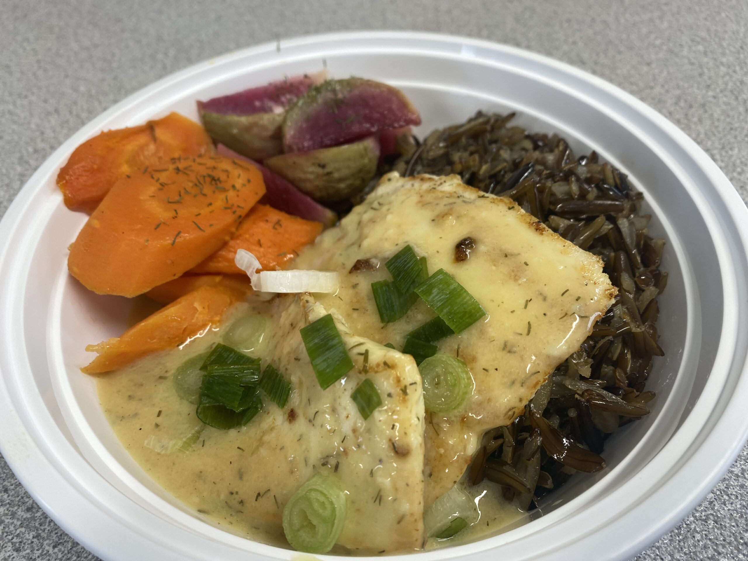 Ingredients: Herbert Fisheries Pike, Olive Oil, Real McCoy Organic Wild Rice, Ferme LaBinette Chicken Broth, Three Fork Watermelon radish, FGF Carrots, organic Dill, Sunflower Oil, Creekbend Farms Honey, Gerber Garlic, Lemon juice, Dijon mustard, Xanthan Gum, Himalayan Pink Salt, Pepper, Green onions.
