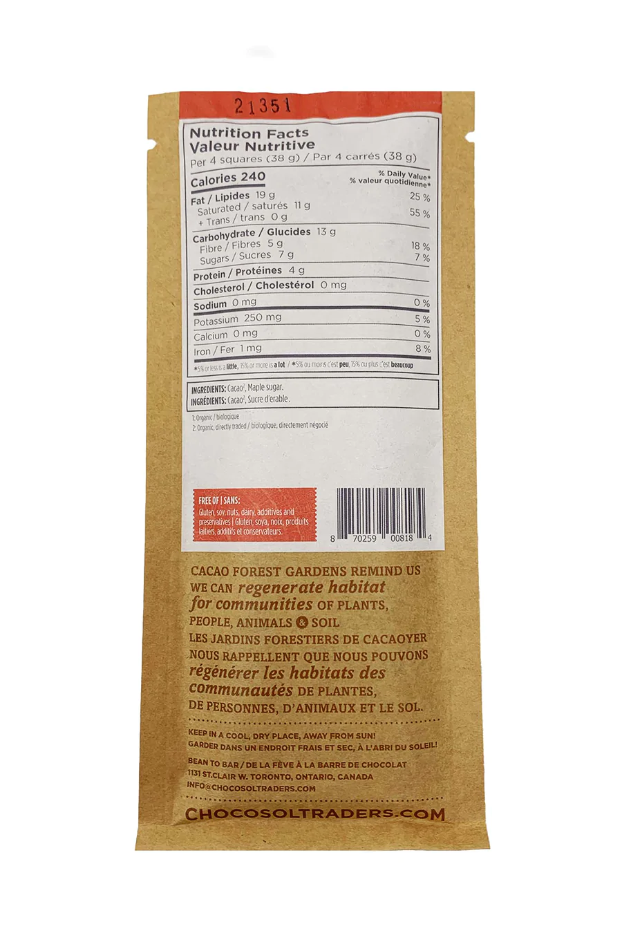 Ingredients: Roasted cacao nibs, maple sugar 90% Cacao content
